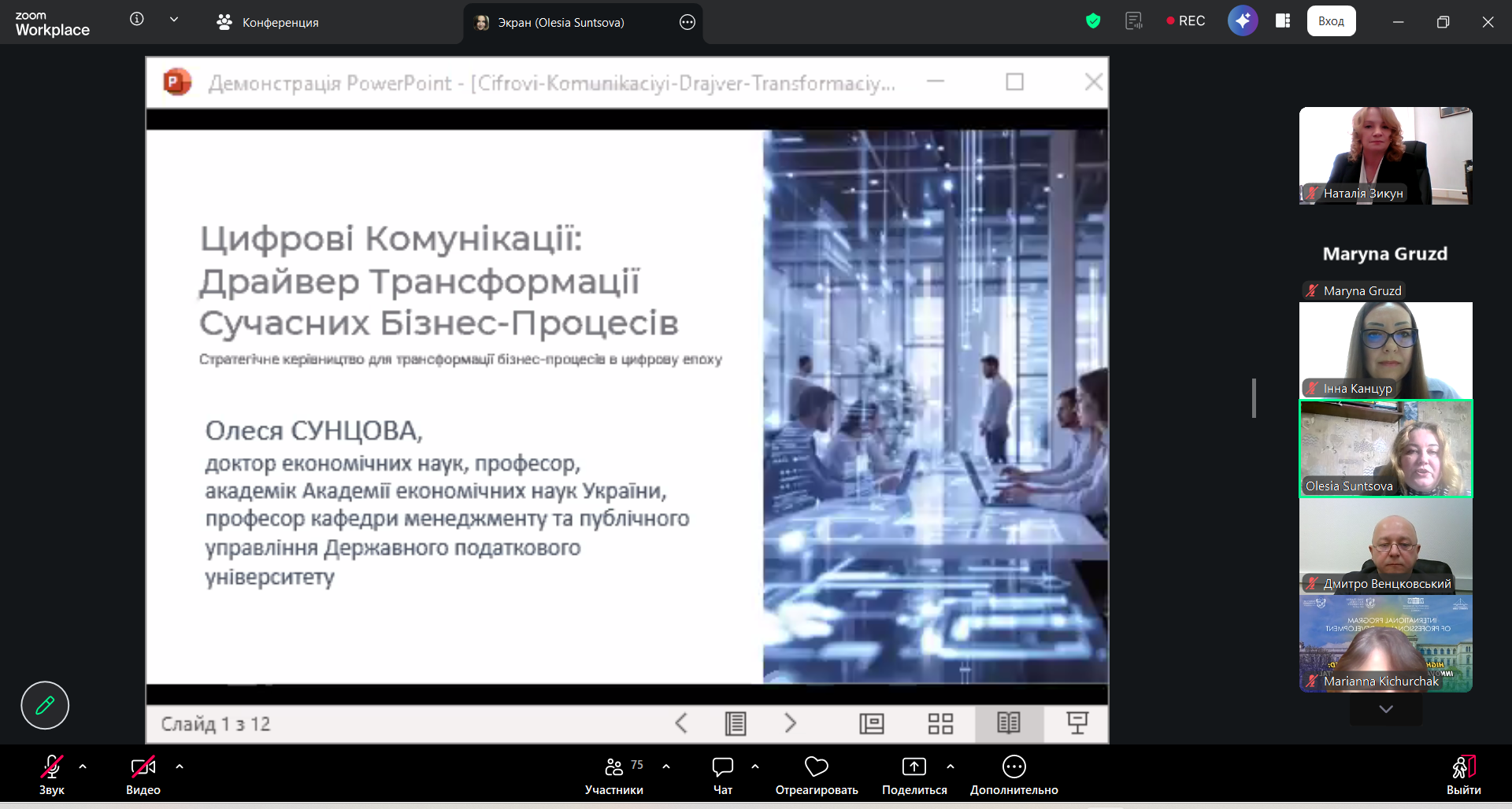 Сунцова Олеся Олександрівна, доктор економічних наук, професор, професор кафедри менеджменту та публічного управління, академік Академії економічних наук України, Державний податковий університет, м. Ірпінь, Україна. Тема доповіді: «Цифрові комунікації як драйвер трансформації сучасних бізнес процесів»;