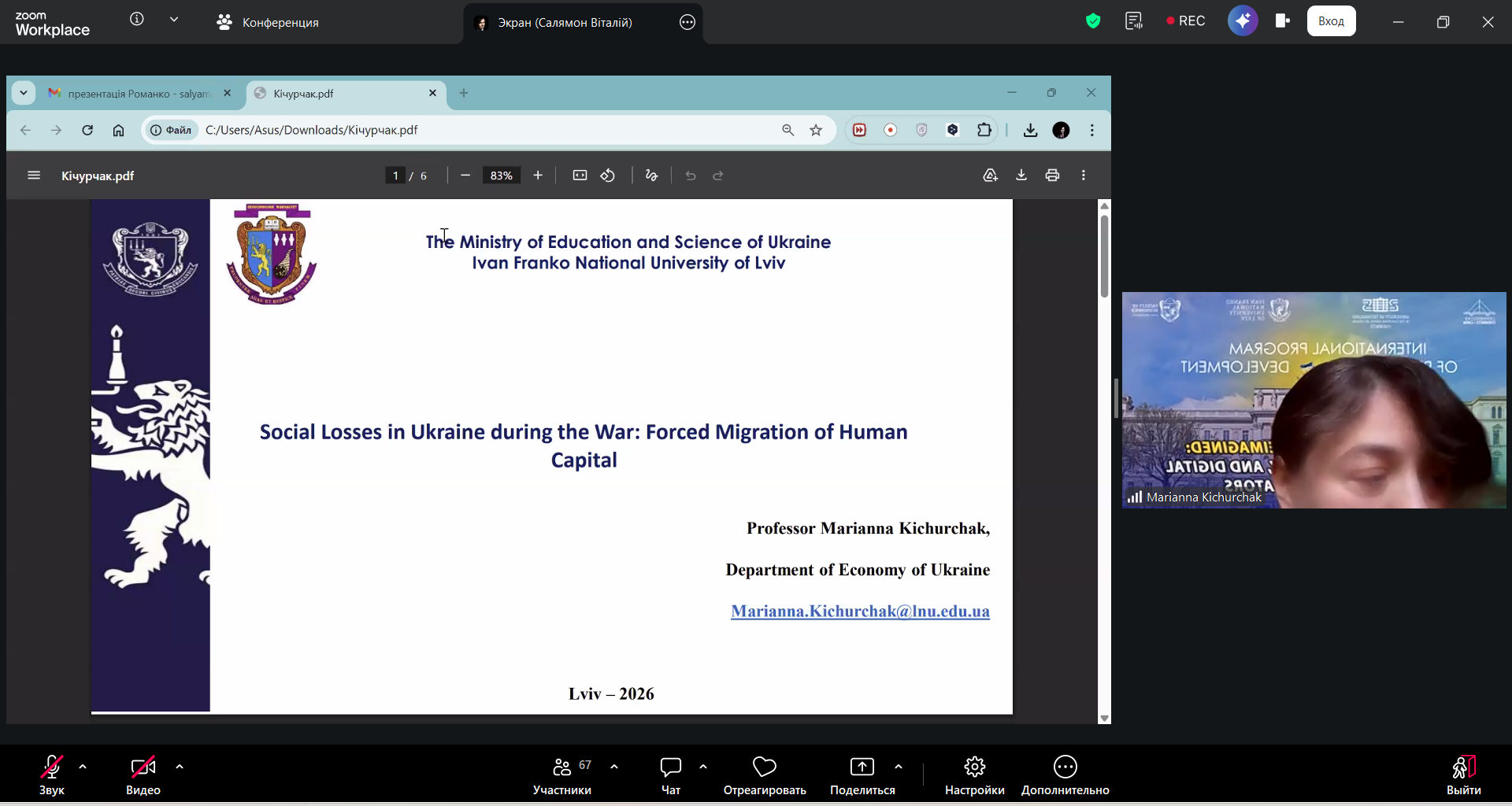Кічурчак Маріанна Василівна, доктор економічних наук, професор, в.о. завідувача кафедри економіки України, Львівський національний університет імені Івана Франка, м. Львів, Україна. Тема доповіді: «Соціальні втрати України в умовах війни: вимушена міграція людського капіталу»;