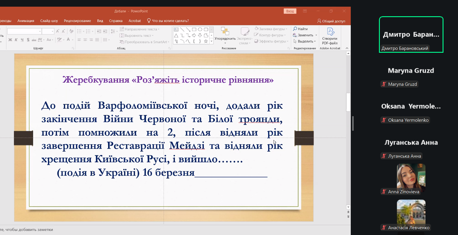 Кожна команда учасників намагалася прокласти свій шлях крізь лабіринт суперечок, вражаючи журі та глядачів блиском фактів і силою риторики. Атмосфера була насичена напругою, наче перед великою битвою, де перемога вимірюється не лише рахунком, а вмінням захопити увагу та серця слухачів.