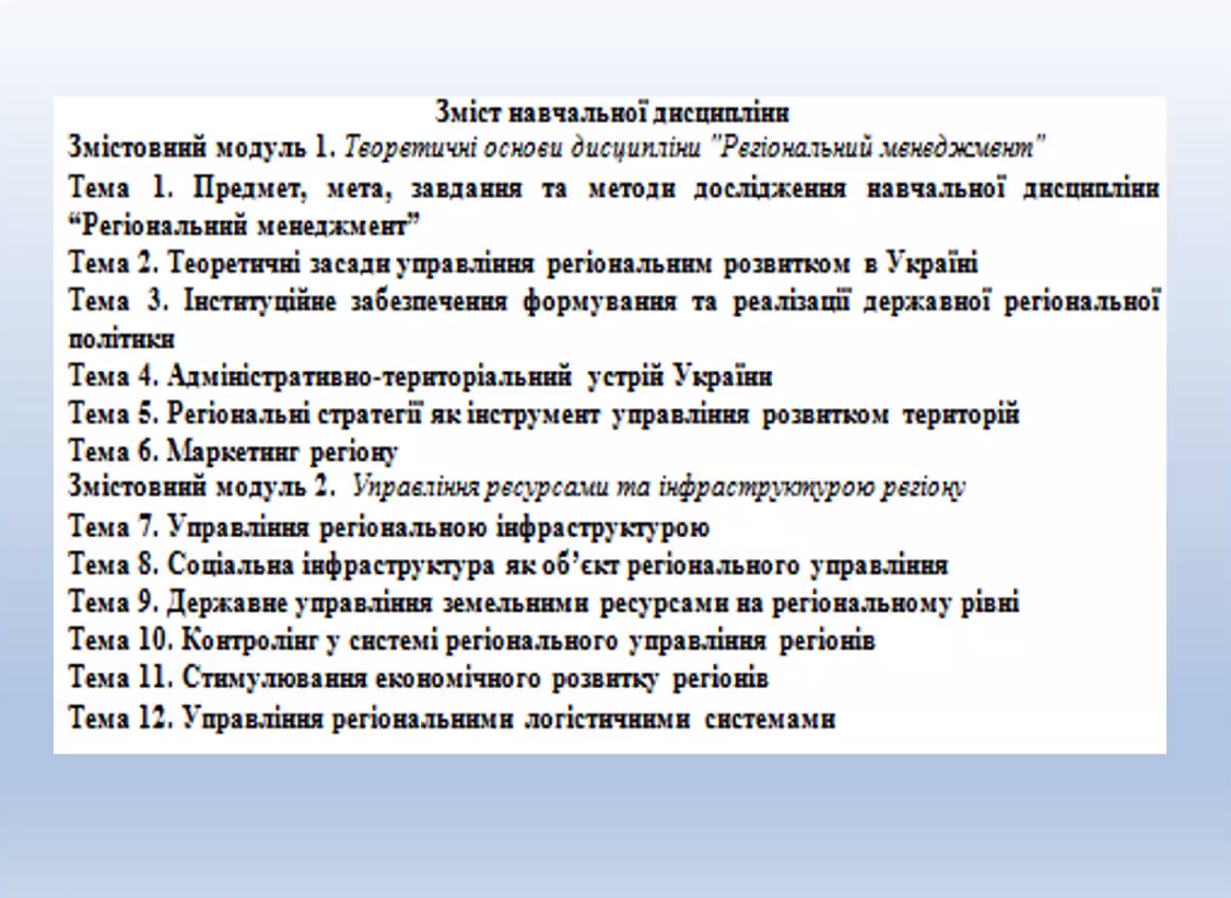 До пулу спеціальності «Публічне управління та адміністрування» освітньої програми «Публічне управління» першого (бакалаврського) рівня вищої освіти на 2026 – 2027 навчальний рік було включено: 1) «Комунікативний менеджмент» (відповідальний викладач – д.е.н., проф. Белявцева В. В.); 2) «Проектний менеджмент в публічній сфері» (відповідальний викладач – к.е.н., доц. Мельник В. І.); 3) «Інноваційний менеджмент в публічній сфері» (відповідальний викладач – к.е.н., доц. Грузд М. В.), 4) «Регіональний менеджмент» (відповідальний викладач – к.е.н., доц. Соболев В. Г.); 5) «Планування розвитку територій» (відповідальний викладач – к.е.н., доц. Єрмоленко О. О.); 6) «Державне регулювання економіки» (відповідальний викладач – к.е.н., доц. Шумська Г. М.), 7) «Фінансовий менеджмент в публічній сфері» (відповідальний викладач – к.е.н., доц. Мельник В. І.); 8) «Політичні інститути та процеси» (відповідальний викладач – к.е.н., доц. Мельник В. І.); 9) «Управління змінами» (відповідальний викладач – к.е.н., доц. Соболев В. Г.); 10) «Європейська інтеграція та міжнародна співпраця України» (відповідальний викладач – к.е.н., доц. Грузд М. В.). Усі навчальні дисципліни формують професійні (фахові) компетентності освітньої програми «Публічне управління».