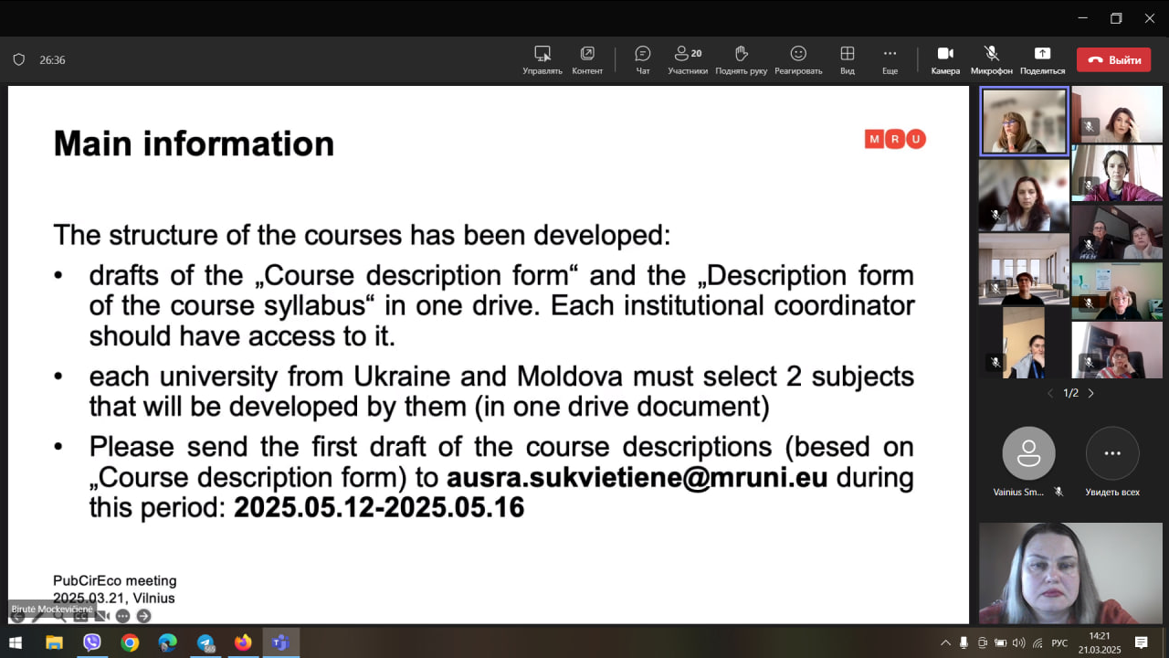 21 березня 2025 року відбулася дистанційна зустріч з партнерами міжнародного проєкту PubCirEco «Вирішальна роль державних службовців у впровадженні циркулярної економіки: впровадження мислення циркулярної економіки у ЗВО».