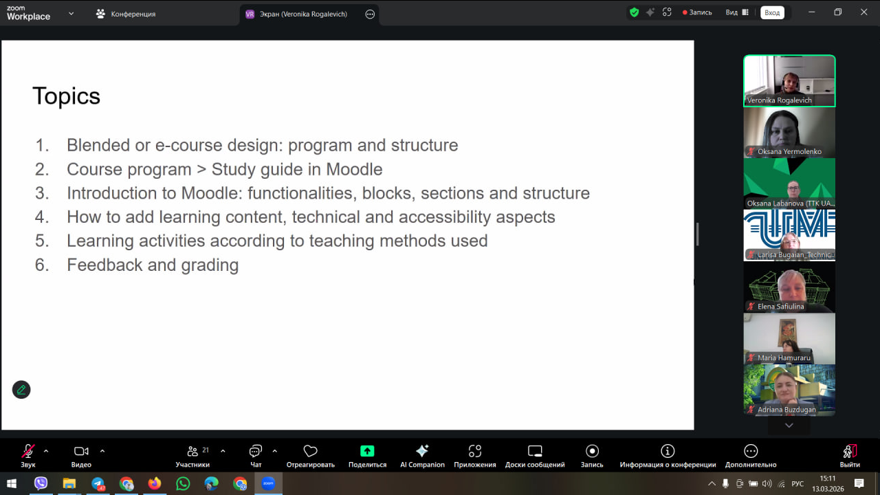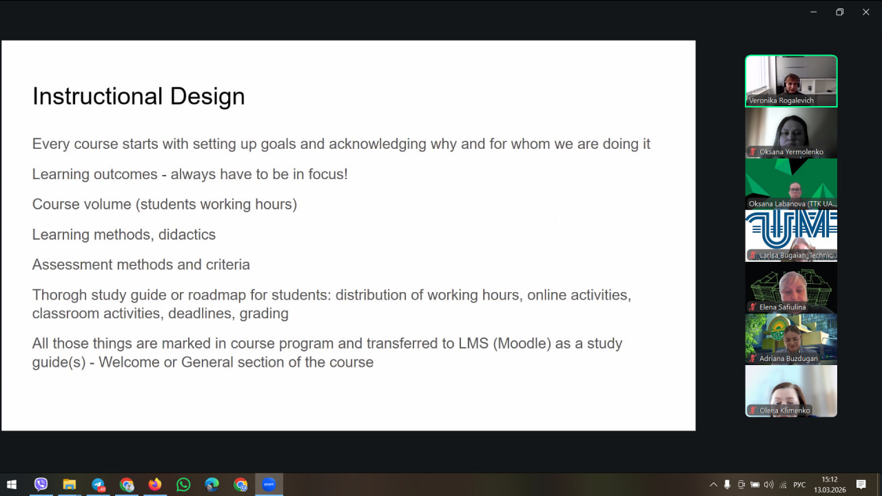 У центрі уваги вебінару були принципи та практичні підходи до створення доступних, структурованих і орієнтованих на здобувачів освіти курсів у системі Moodle. Учасники розглянули ключові етапи підготовки курсу ще до його запуску: визначення цілей і результатів навчання, формування навчальної програми, оцінювання робочого навантаження, а також розробку офіційної програми курсу та вступного гіда для здобувачів.