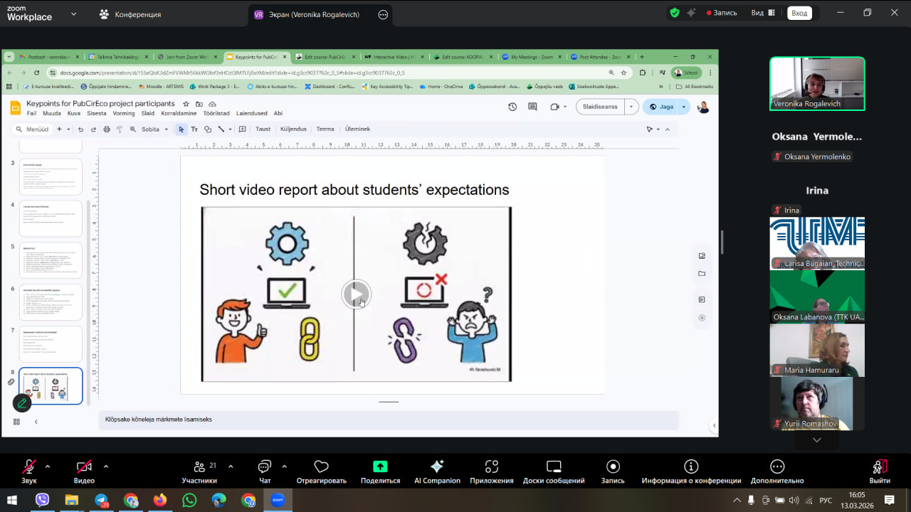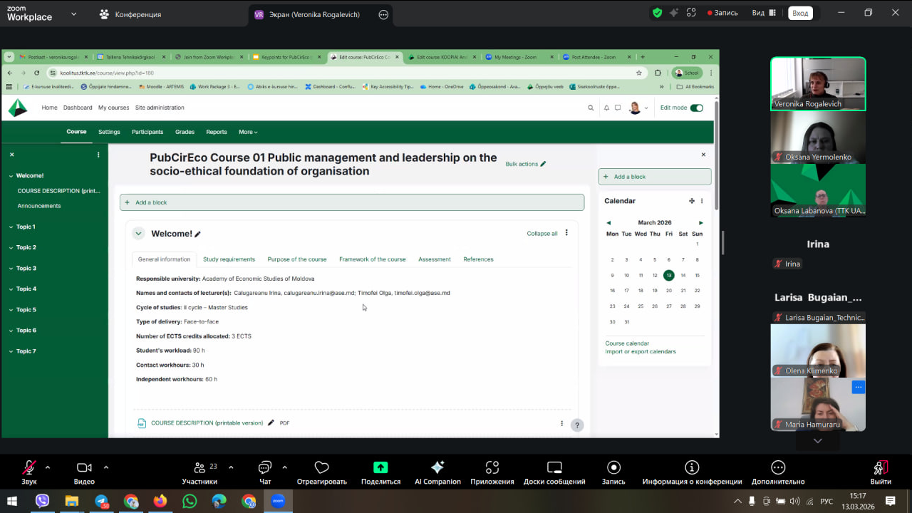 13 березня 2026 року на платформі Zoom відбулася чергова онлайн-зустріч партнерів міжнародного проєкту PubCirEco «Вирішальна роль державних службовців у впровадженні циркулярної економіки: впровадження мислення циркулярної економіки у закладах вищої освіти», присвячена розробці сучасних навчальних курсів.